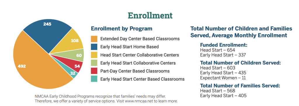 Average 2021 enrollment was lower than funded enrollment, due to the pandemic. The average monthly enrollment for Head Start was 483, or 74% of federally funded enrollment. The average monthly enrollment for Early Head Start was 302, or 90% of federally funded enrollment.