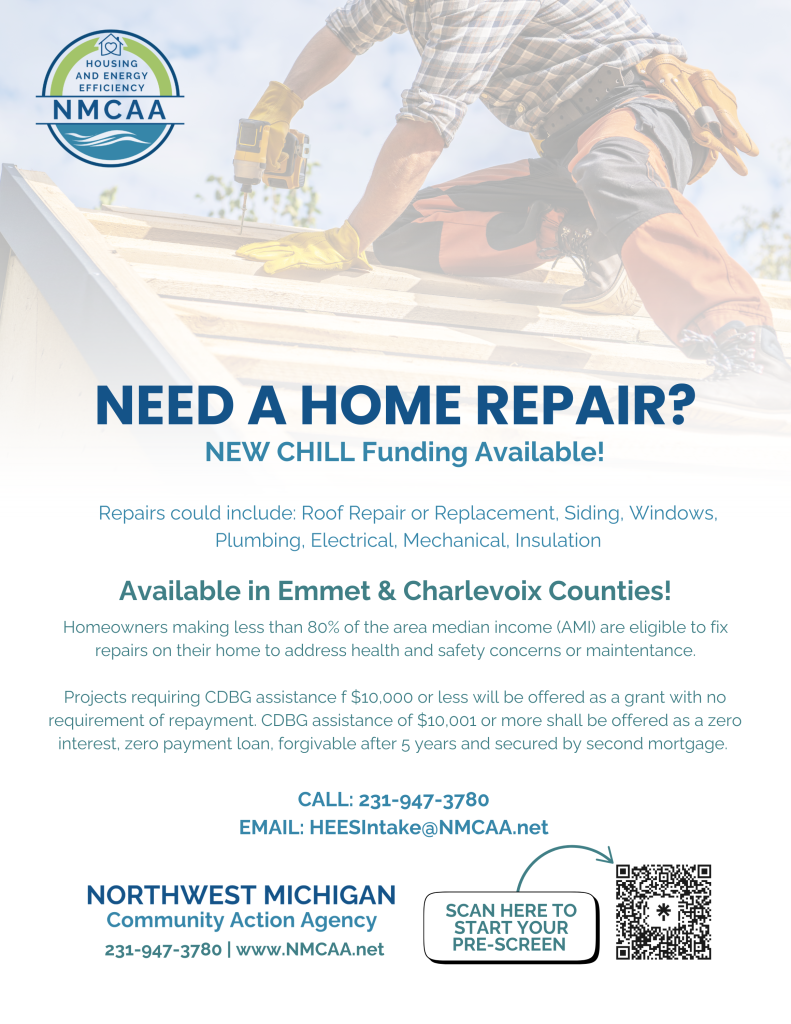 CHILL funding available in Charlevoix and Emmet Counties for Home Repairs including but not limited to Roof Replacement, Siding Windows, Plumbing, Electrical, Mechcanical and Insulation.