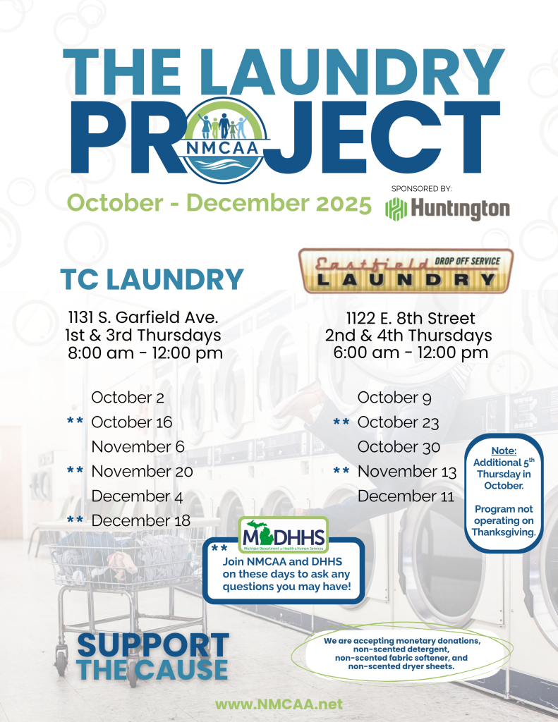 The Traverse City Laundry Project is now open for Eastfield Laundry at 8th Street on the 2nd and 4th Thursday of each month from 8:30 am to 11:30 am. Traverse City Laundry in Garfield Plaza will be the 1st and 3rd Thursday of each month at 8:30 am to 11:30 am.